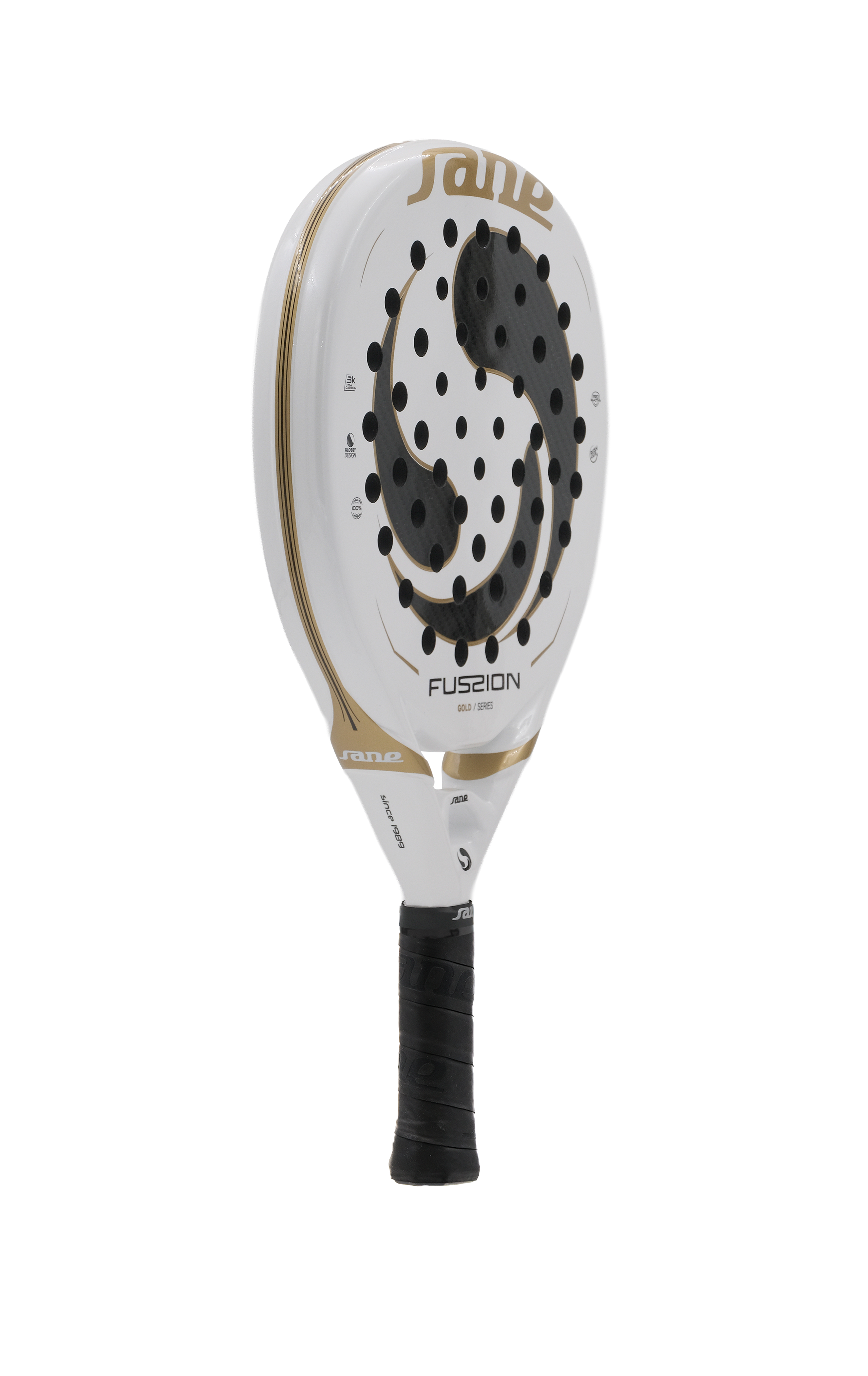 La nueva Fussion GOLD destaca por su diseño híbrido redondo oversized, una forma que ofrece un comportamiento multifuncional capaz de adaptarse a distintos ritmos y estilos de juego. Es la pala ideal para quienes buscan control fino sin renunciar a un rendimiento sólido en situaciones ofensivas.