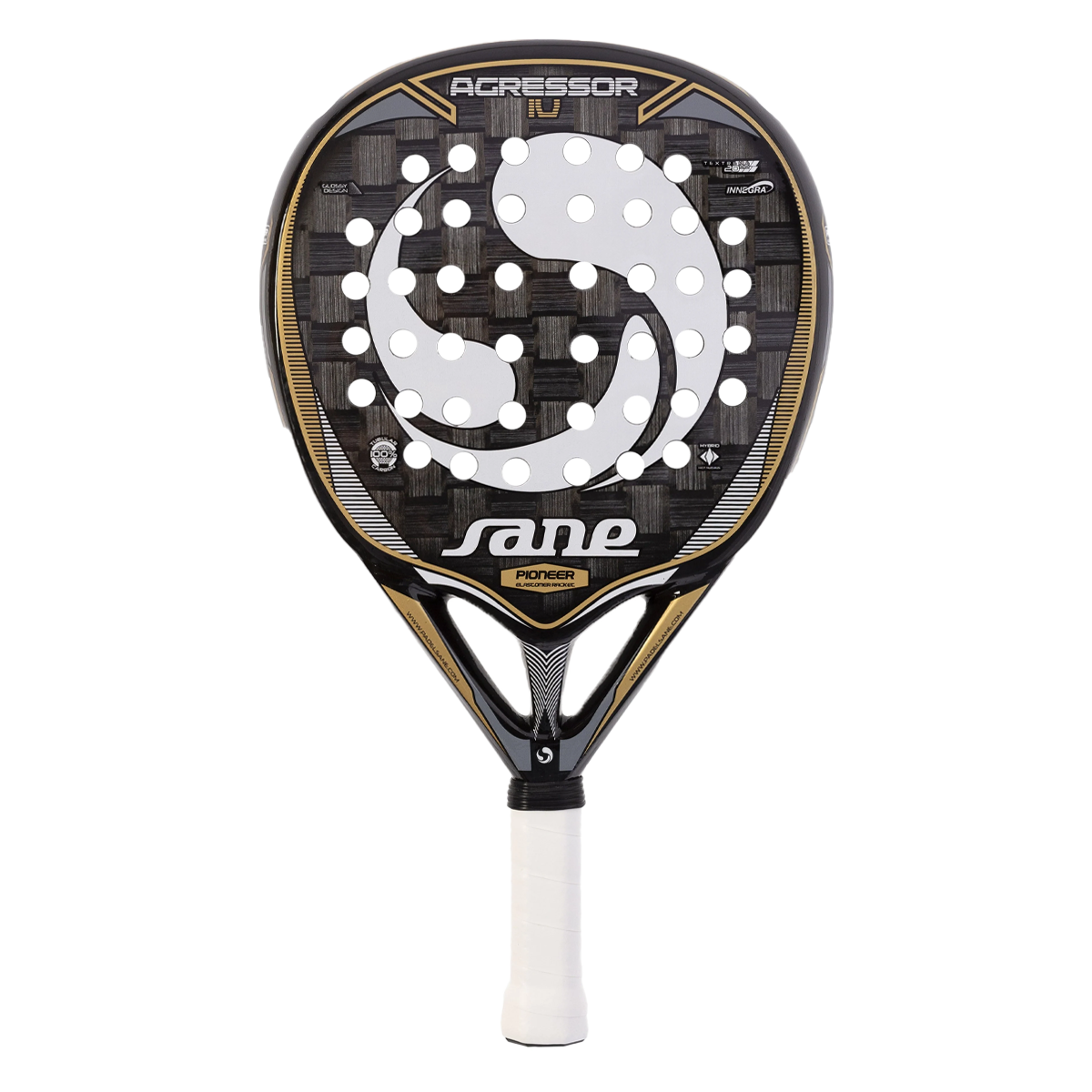 Esta pala posee Tejido de Carbono Textreme 12K+ Innegra, con un núcleo híbrido y un parante que rigidiza la franja vertical central de la pala ante la flexión. También el perfil de arco "Arch Frame" que trabaja a compresión y goza de mayor resistencia a los impactos.